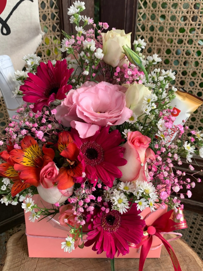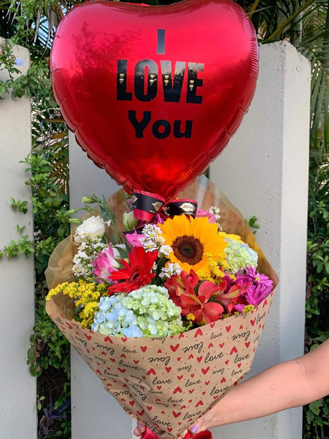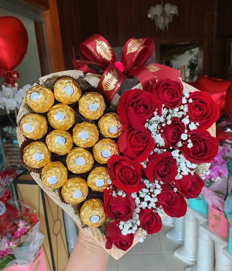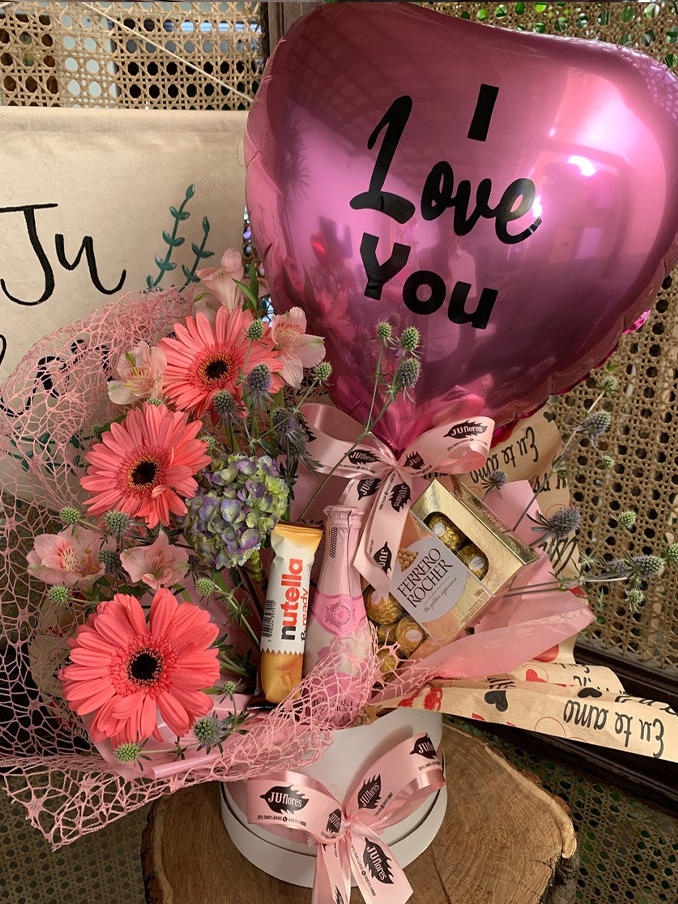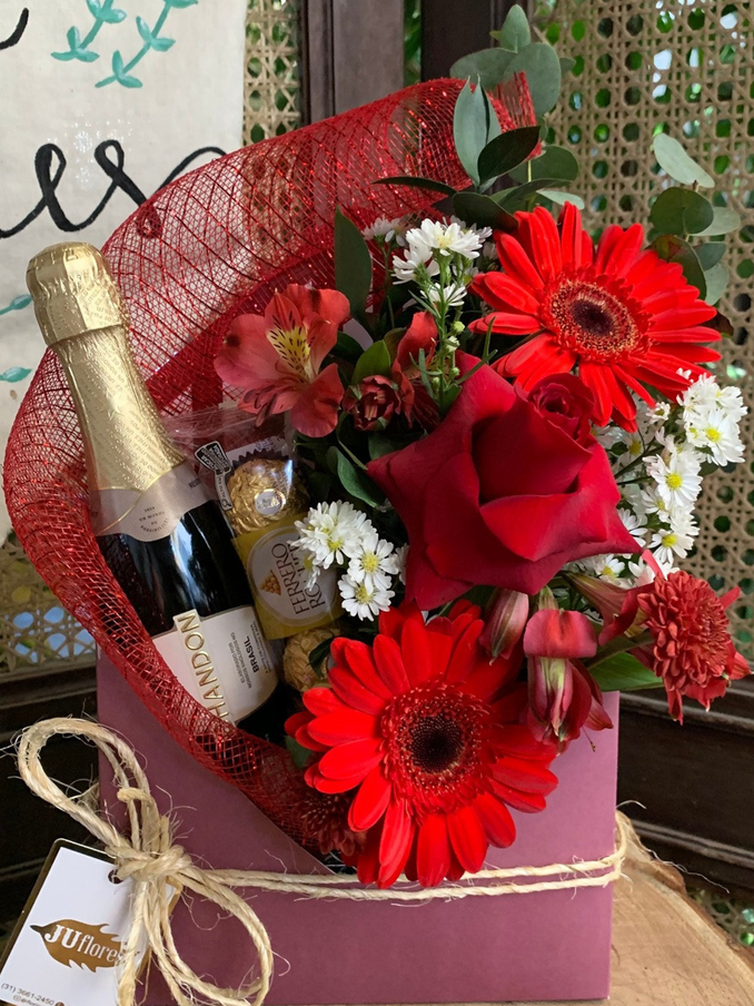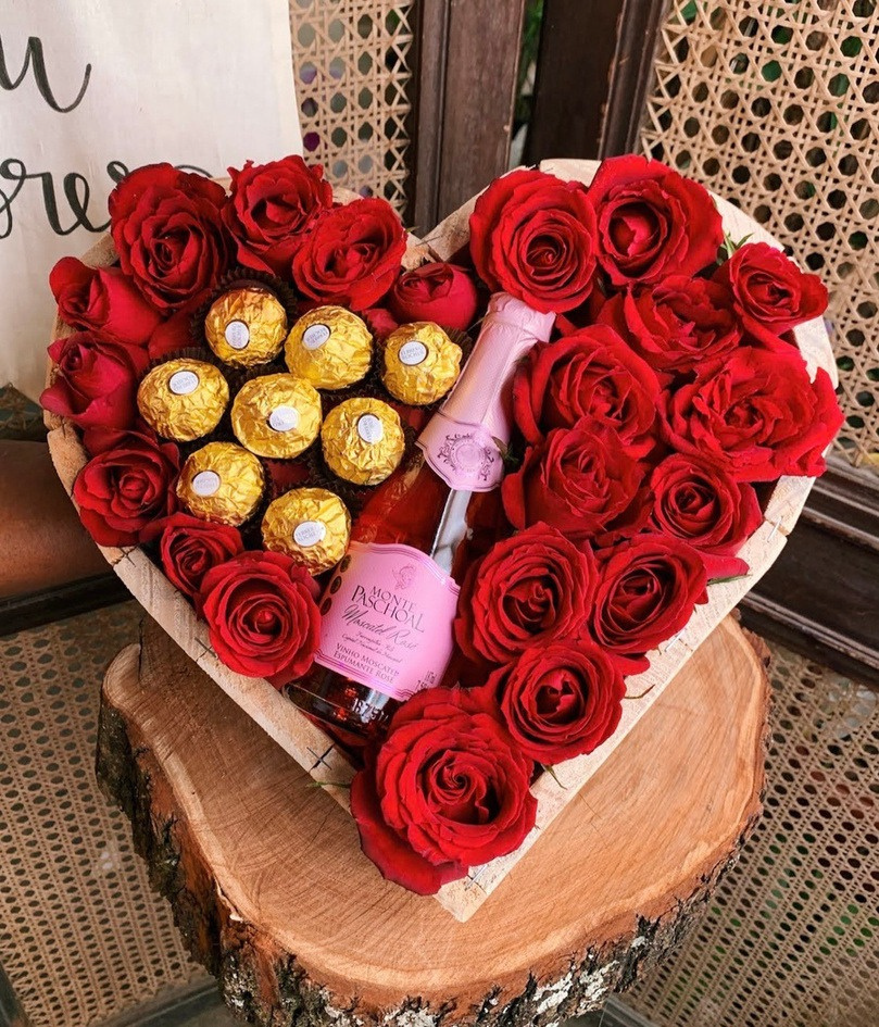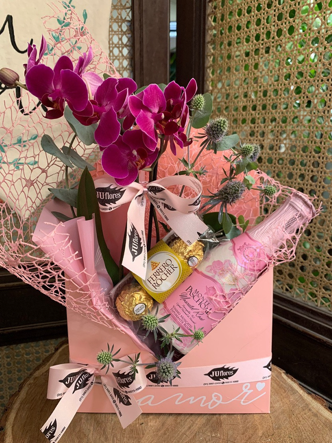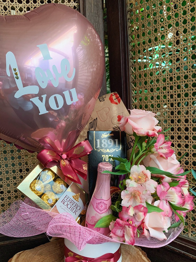 01 arranjo floral 01 espumante Monte Paschoal Moscatel Rosé 187 ml 01 barra 1891 01 Ferrero Rocher 8 unidades 01 Balão coração metalizado