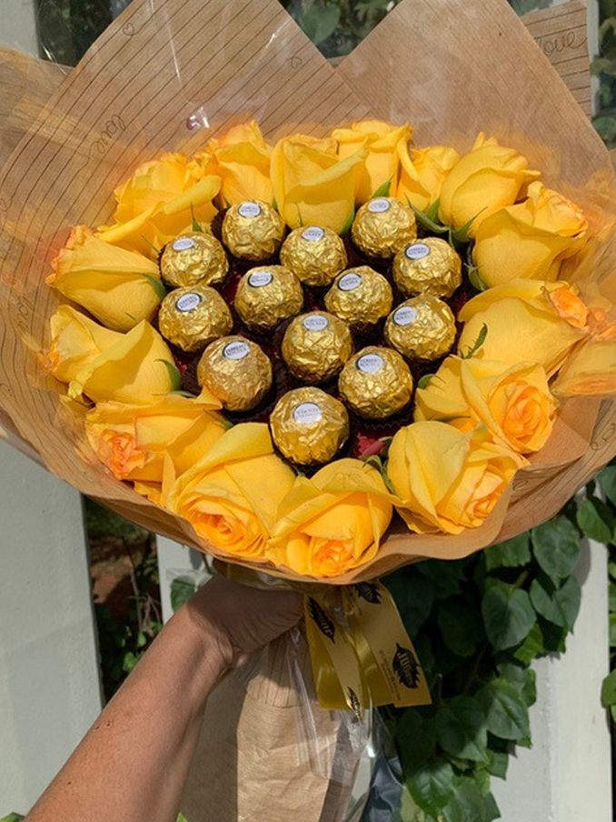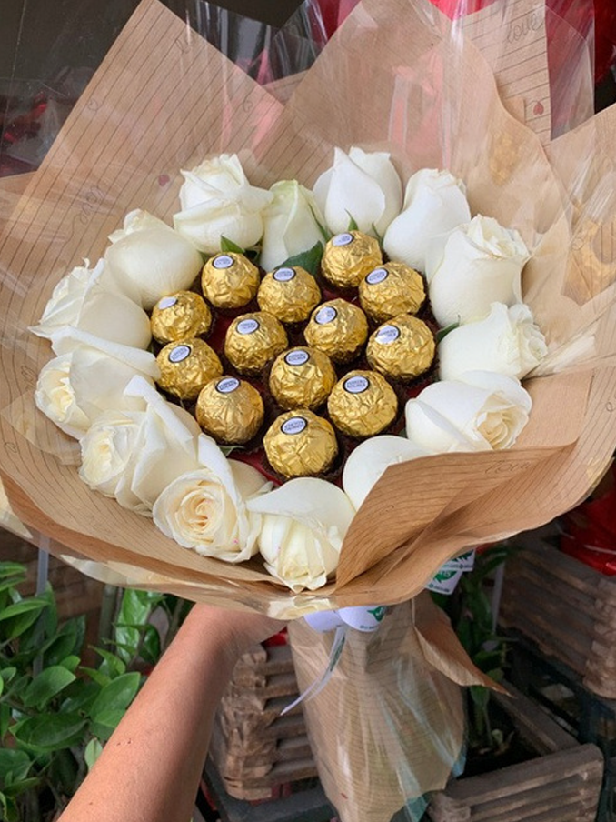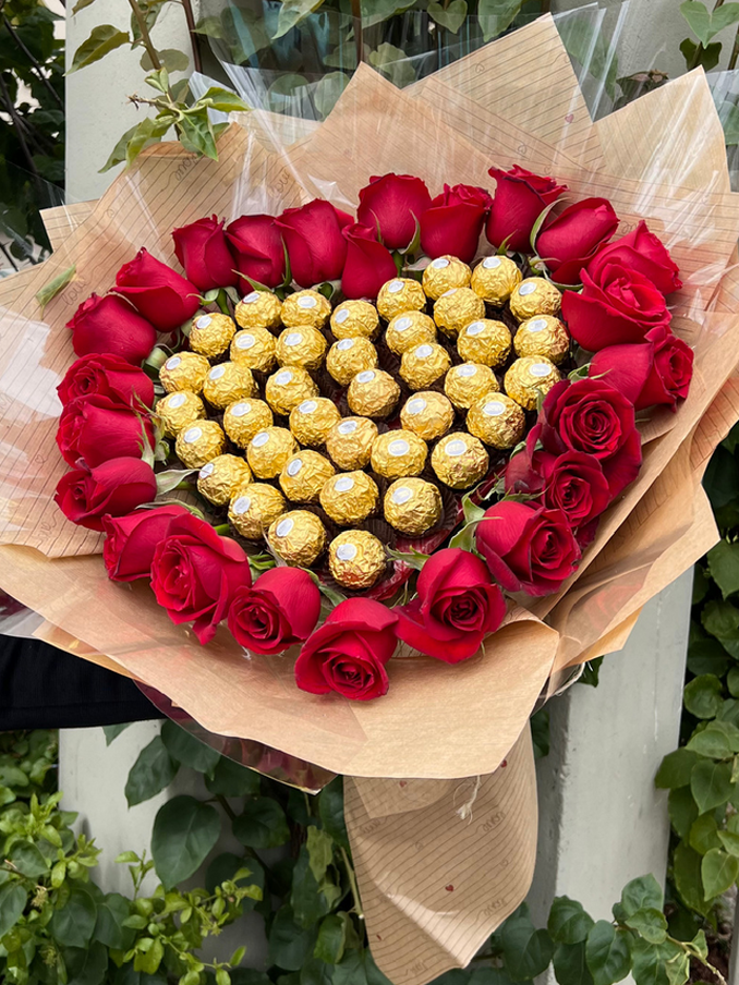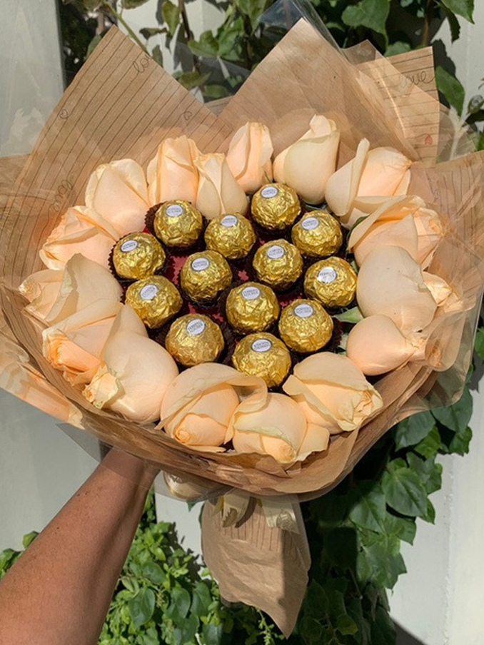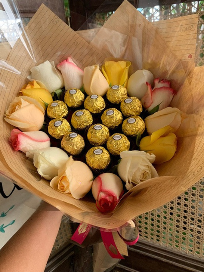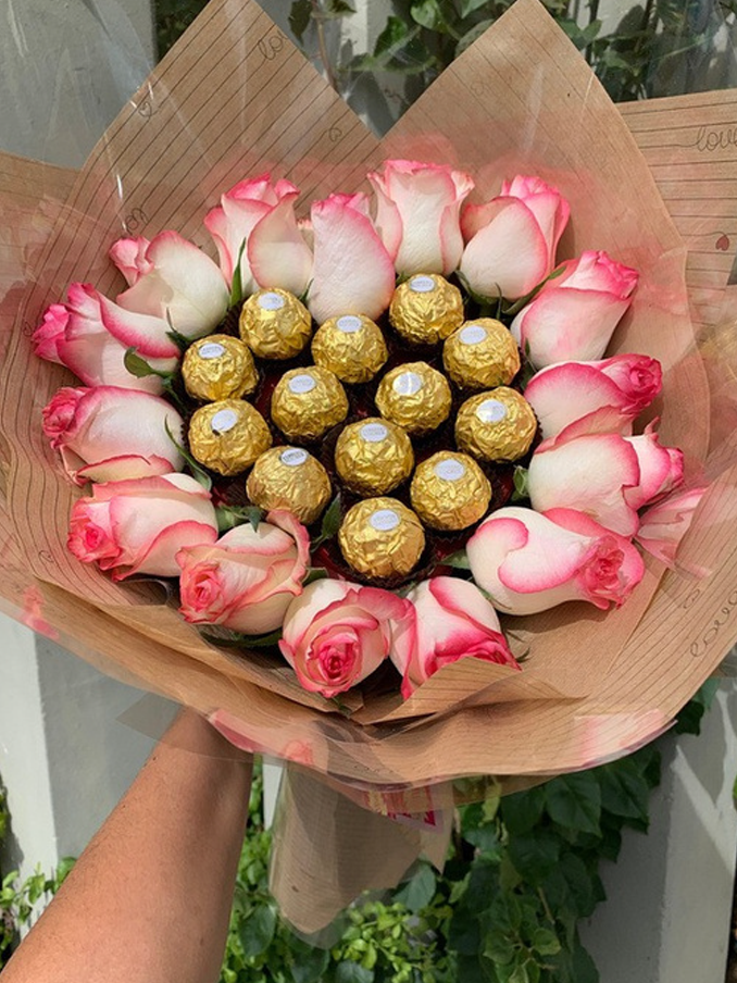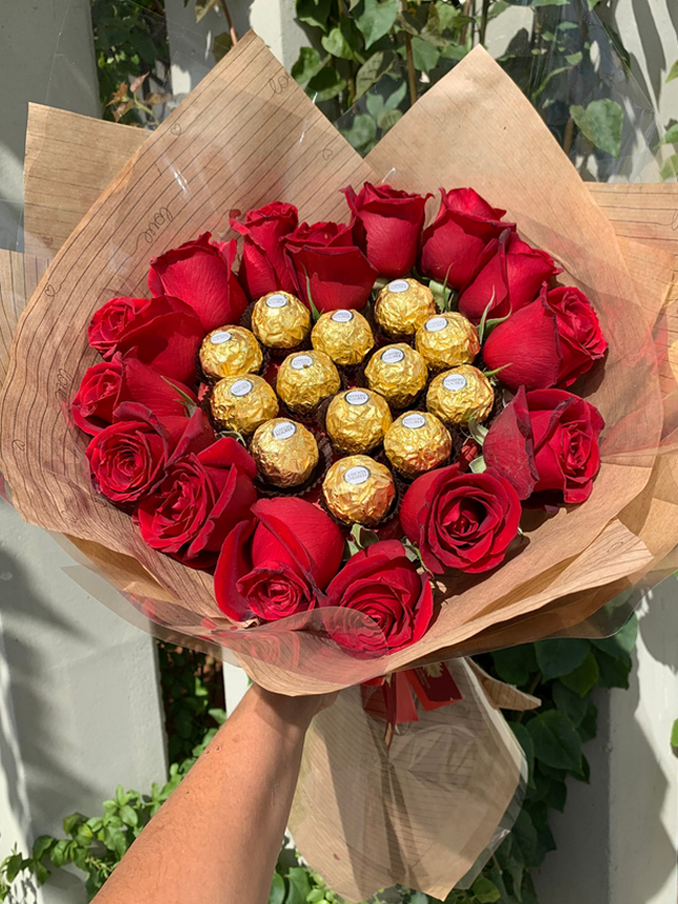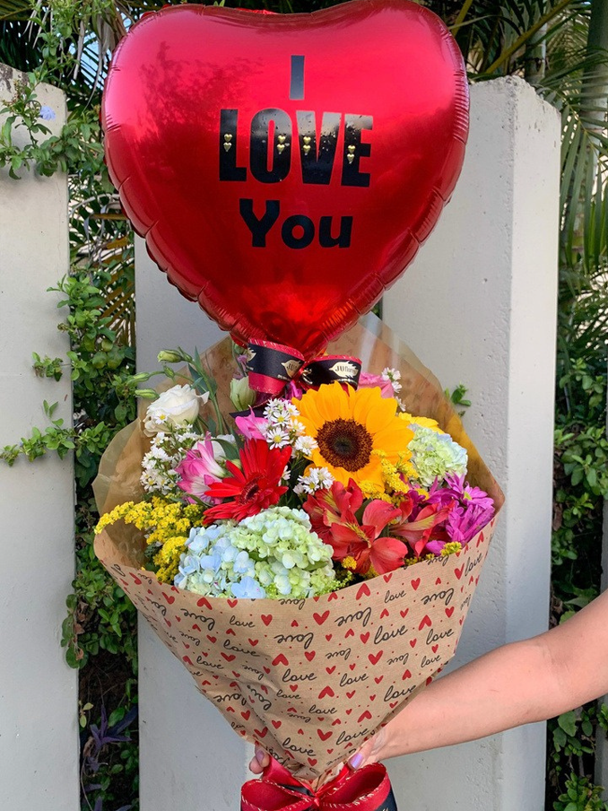 01 arranjo floral 01 espumante Monte Paschoal Moscatel Rosé 187 ml 01 barra 1891 01 Ferrero Rocher 8 unidades 01 Balão coração metalizado