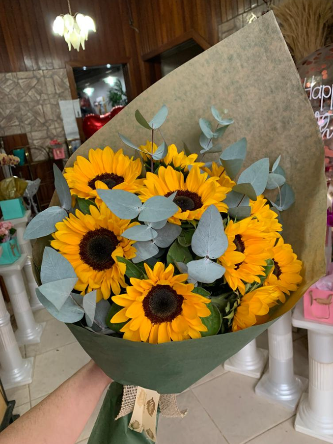 Bouquet confeccionado com 10 girassóis. Preço: R$ 450,00