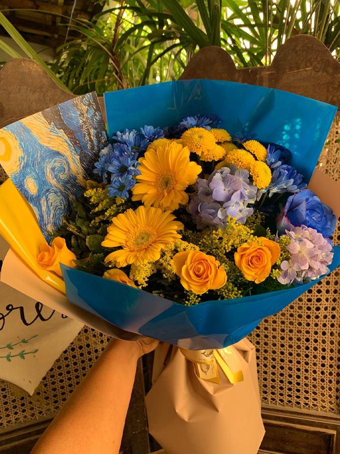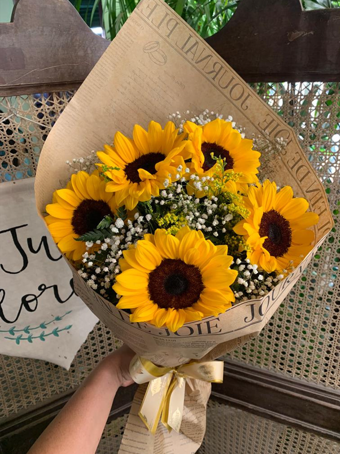 Bouquet confeccionado com 5 girassóis. Preço: R$ 250,00