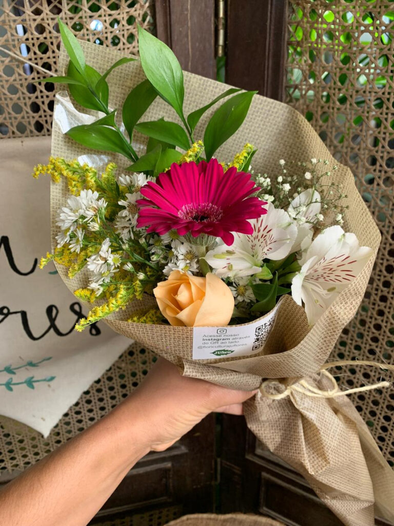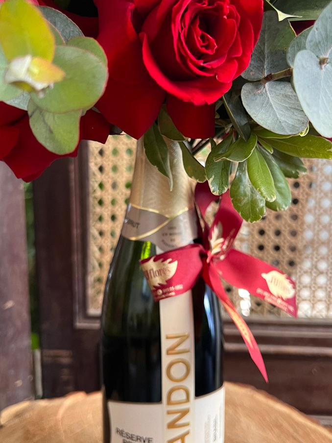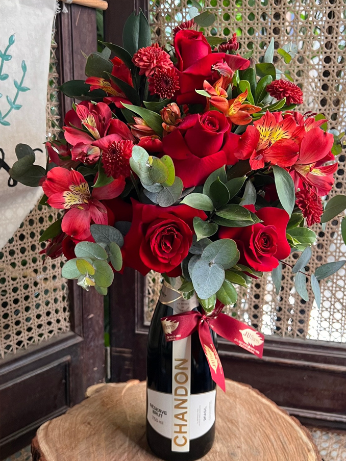 Bouquet confeccionado com 10 rosas, alstromerias, flores do campo e folhagens nobres. 01 Chandon Réserve Brut 750 ml