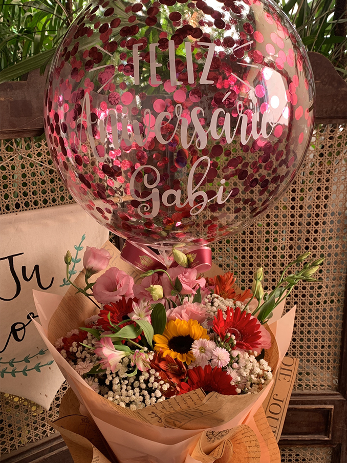 Você pode personalizar qualquer produto desde catálogo com um balão adicional: Coração metalizado: por R$45,00 ou Balão Bubble personalizado (consultar valores no portfólio específico deste produto).