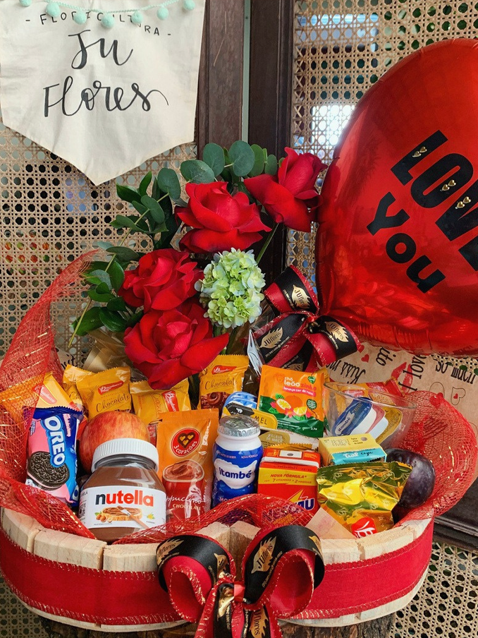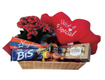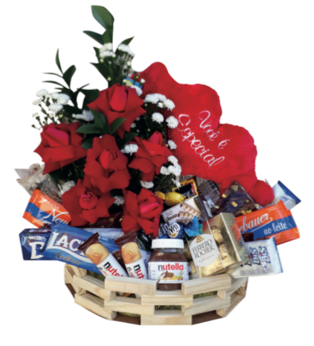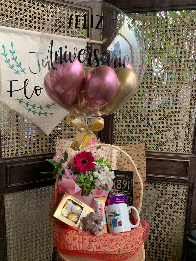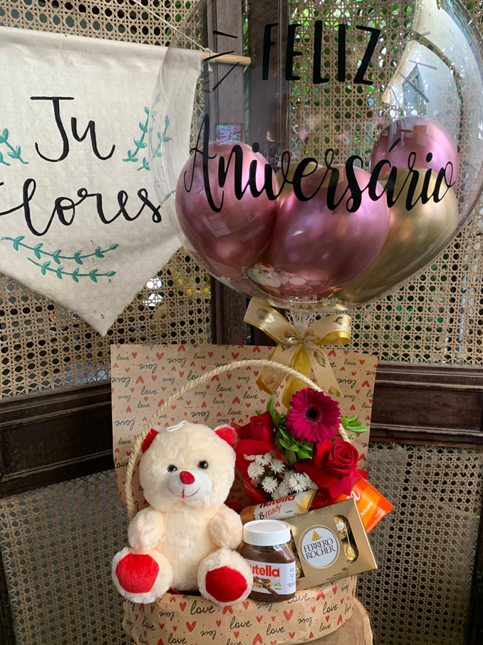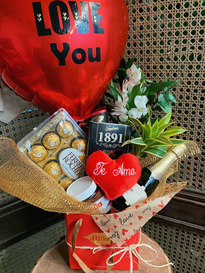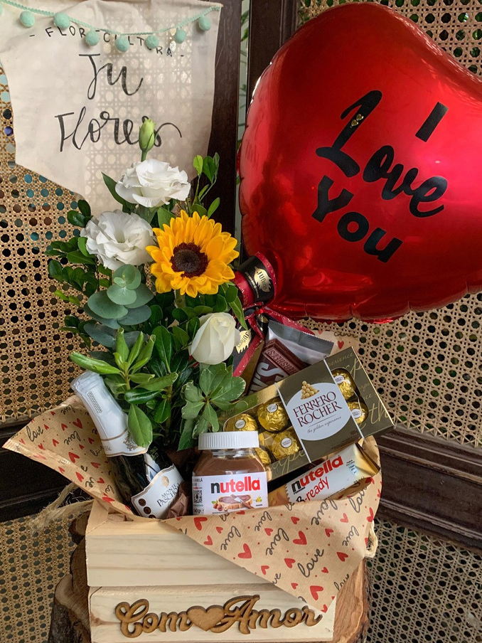 01 arranjo floral 01 espumante Chandon 187 ml 01 Nutella 140 g 01 Ferrero Rocher 12 unidades 01 barra 1891 90 g 01 Nutella B-ready 22g 01 Balão coração metalizado