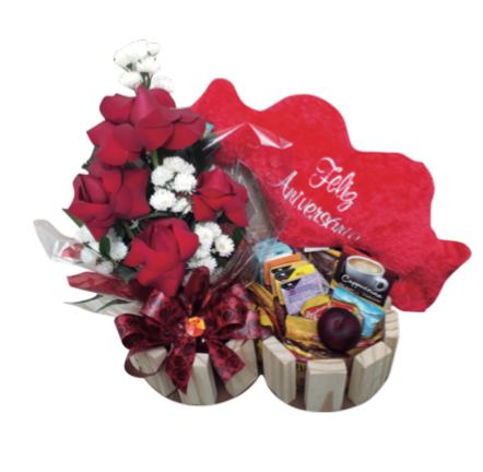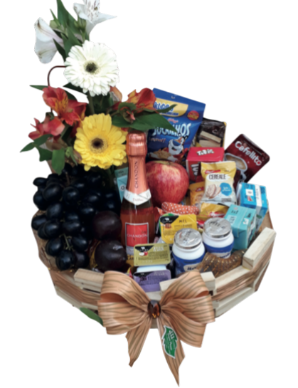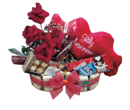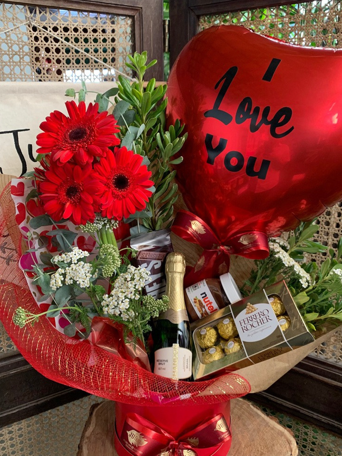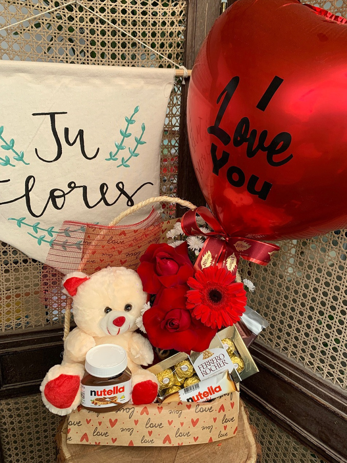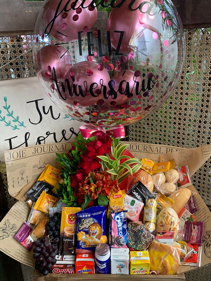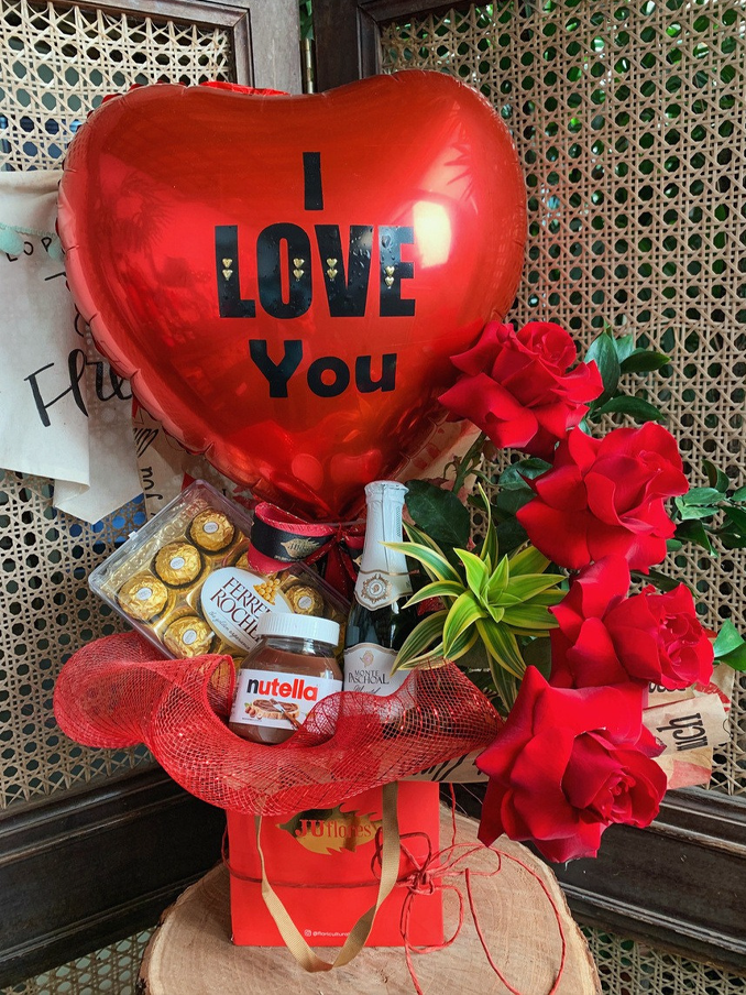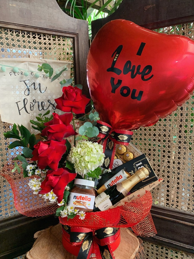 01 arranjo floral 01 espumante Chandon 187 ml 01 Nutella 140 g 01 Ferrero Rocher 12 unidades 01 barra 1891 90 g 01 Nutella B-ready 22g 01 Balão coração metalizado